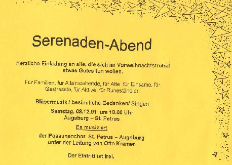 | 08.12.01 | St. Petrus | Serenaden-Abend im Advent | 17 Uhr |